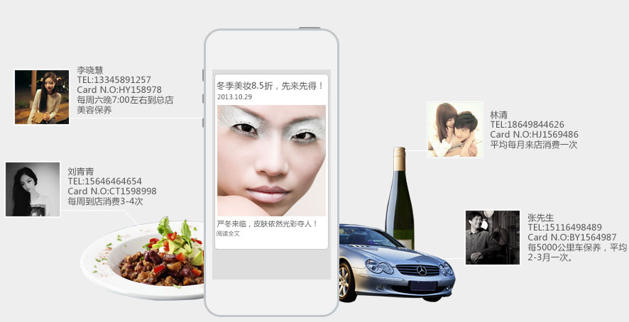 微信营销会员卡通过在微信内植入会员卡,基于全国4亿微信用户,帮助企业建立集品牌推广、会员管理、营销活动、统计报表于一体的微信会员管理平台。清晰记录企业用户的消费行为并进行数据分析;还可根据用户特征进行精细分类,从而实现各种模式的精准营销。