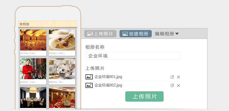 在微相册里,您可以方便的创建相册,轻松地发布您需要展示的照片,还可以拓展为商家开展活动的一种展现方式。